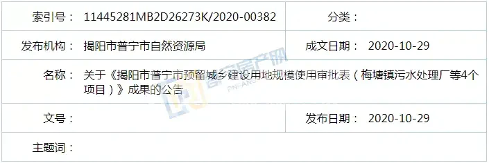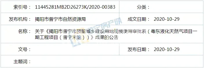 近日,普宁市自然资源局分别发布了关于《揭阳市普宁市预留城乡建设用地规模使用审批表(梅塘镇污水处理厂等4个项目)》成果的公告和关于《揭阳市普宁市预留城乡建设用地规模使用审批表(粤东液化天然气项目一期工程项目(普宁末站))》成果的公告。《审批表》落实地块总面积4.8382公顷(72.573亩),落实后落实地块全部调整为规划城乡建设用地。据悉,这两份《审批表》分别于2020年10月26日和27日通过揭阳市自然资源局审批。根据相关法律、法规要求,现将《审批表》成果向社会公告。