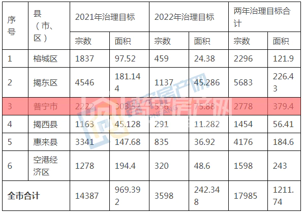 方案中提到,在揭阳全市深入开展普查在册在建违法建设分类处置行动,争取2021年底前,消化80%以上在建违法建设,确保2022年底前,基本完成消化。其中普宁2021年治理目标是2222宗303.52万平方米,2022年治理目标是556宗75.88万平方米,两年治理目标合计2778宗379.4万平方米。