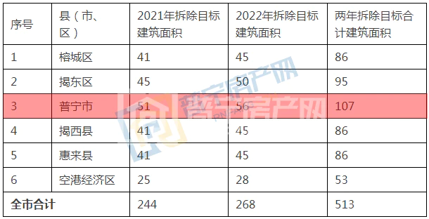 打好违法建设治理攻坚战,普宁市2021年拆除目标建筑面积51万平方米,2022年拆除目标建筑面积56万平方米。