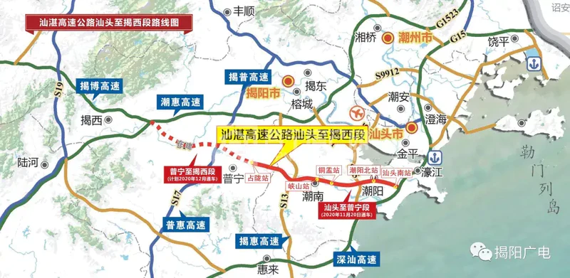 汕湛高速公路汕头至揭西段项目是广东高速公路网中汕头至湛江高速公路的起点段,是服务粤东地区出行、补齐区域发展短板的重要交通工程。目前汕湛高速公路汕头至普宁占陇段(K0+000-K49+047段)已建设完成,并经交工验收合格,定于2020年11月20日10:30开始,对过往车辆收取车辆通行费。普宁至揭西段计划2020年12月通车。