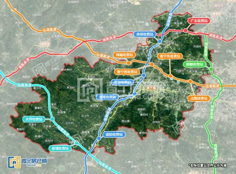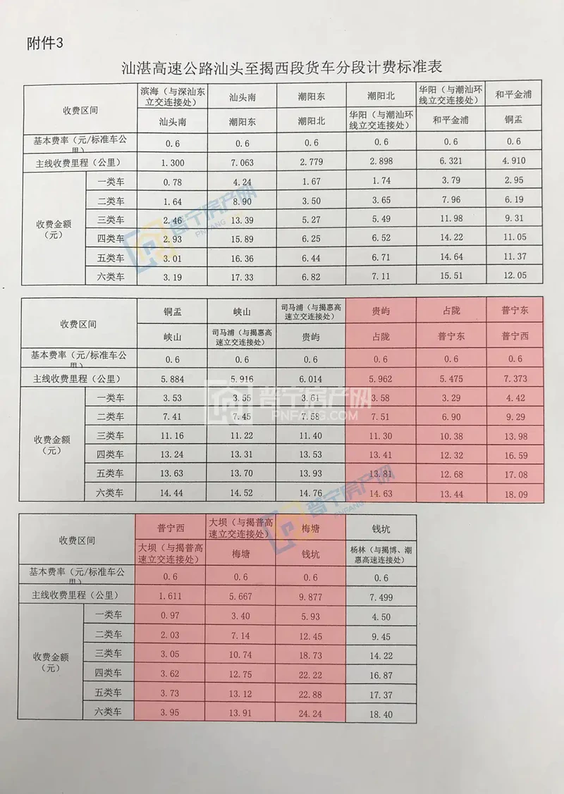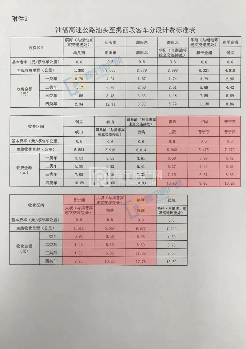 汕头南收费站 连接汕头市濠江区河浦大道,设置滨海枢纽互通立交与沈海高速深汕东段互联互通。濠江和普宁方向来往车辆可通过此站上下汕湛高速。 潮阳北收费站 连接省道234线。潮阳城区来往车辆可通过此站上下汕湛高速。 铜盂收费站 连接省道237线,省道237沿线的和平、铜盂、谷饶片区等镇来往车辆可通过此站上下汕湛高速。 峡山收费站 连接北环大道。潮南城区来往车辆可通过此站上下汕湛高速。 占陇收费站 连接县道X110(麒麟~南径~占陇~大南山(楼盘详情户型图相册地图)公路),普宁市占陇镇和南径镇来往车辆可通过此站上下汕湛高速。 收费标准 结语 汕湛高速公路普宁段共设置四个出入口,分别为:占陇互通、普宁东互通、普宁西互通、梅塘互通。接下来汕湛高速公路汕头至揭西段的全线通车,项目将成为快速联通粤东地区与粤港澳大湾区、贯通沿海经济带的交通大动脉。 随着汕湛高速的建成,我市将拥有四条高速公路,再加上即将建设的第五条高速—陆惠高速,将以普宁市城市规划区为中心,形成“三横两纵”的高速公路网布局,三横为潮惠高速、汕湛高速和陆惠高速,两纵为揭普高速和揭惠高速。进一步巩固揭阳“粤东陆上交通枢纽”的地位,对带动沿线周边经济发展,方便沿线百姓出行具有重大意义。