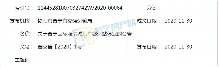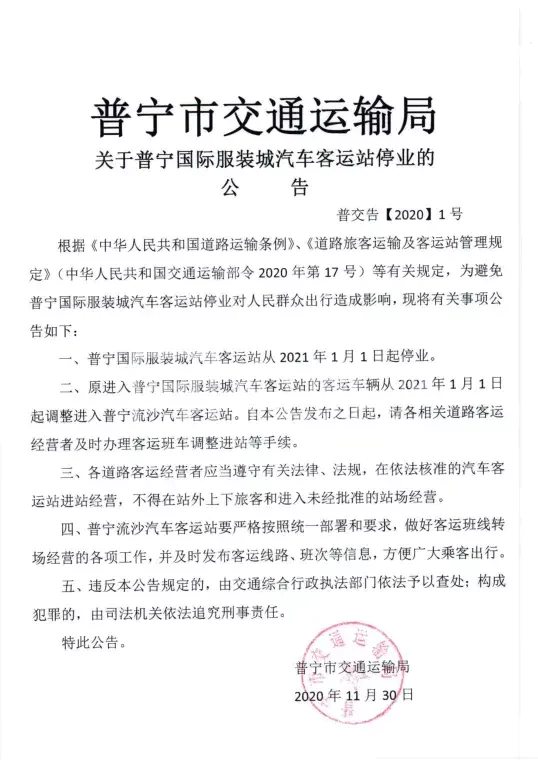 根据《中华人民共和国道路运输条例》、《道路旅客运输及客运站管理规定》(中华人民共和国交通运输部令2020年第17号)等有关规定,为避免普宁国际服装城汽车客运站停业对人民群众出行造成影响,现将有关事项公告如下: