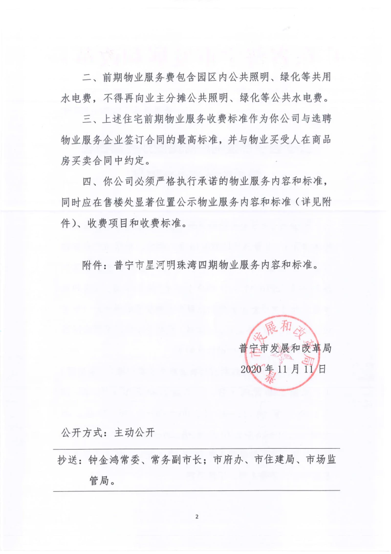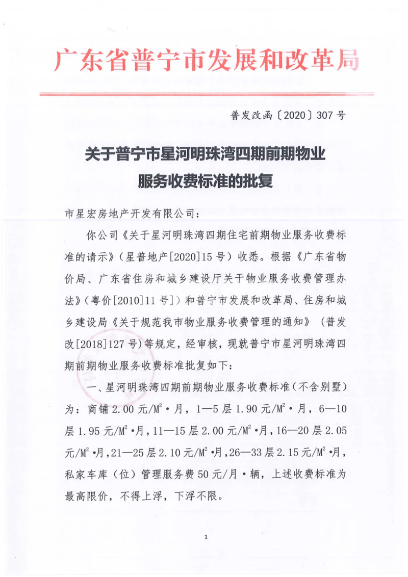 你公司《关于星河明珠湾四期住宅前期物业服务收费标准的请示》 (星普地产[2020]15号)收悉。根据《广东省物价局、广东省住房和城乡建设厅关于物业服务收费管理办法》 (粤价[2010] 11号])和普宁市发展和改革局、住房和城乡建设局《关于规范我市物业服务收费管理的通知》 (普发改[2018]127号)等规定,经审核,现就普宁市星河明珠湾四期前期物业服务收费标准批复如下: