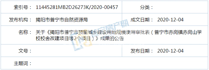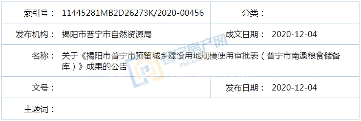 关于《揭阳市普宁市预留城乡建设用地规模使用审批表(普宁市南溪粮食储备库)》成果的公告