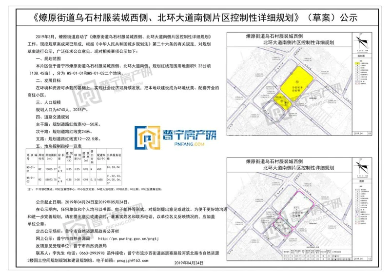 《燎原街道乌石(楼盘详情户型图相册地图)村服装城西侧、北环大道南侧片区控制性详细规划》(草案)公示,规划人口为6740人,2015户,将建设成为环境优美、配套齐全的商住小区。