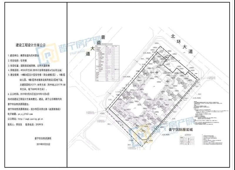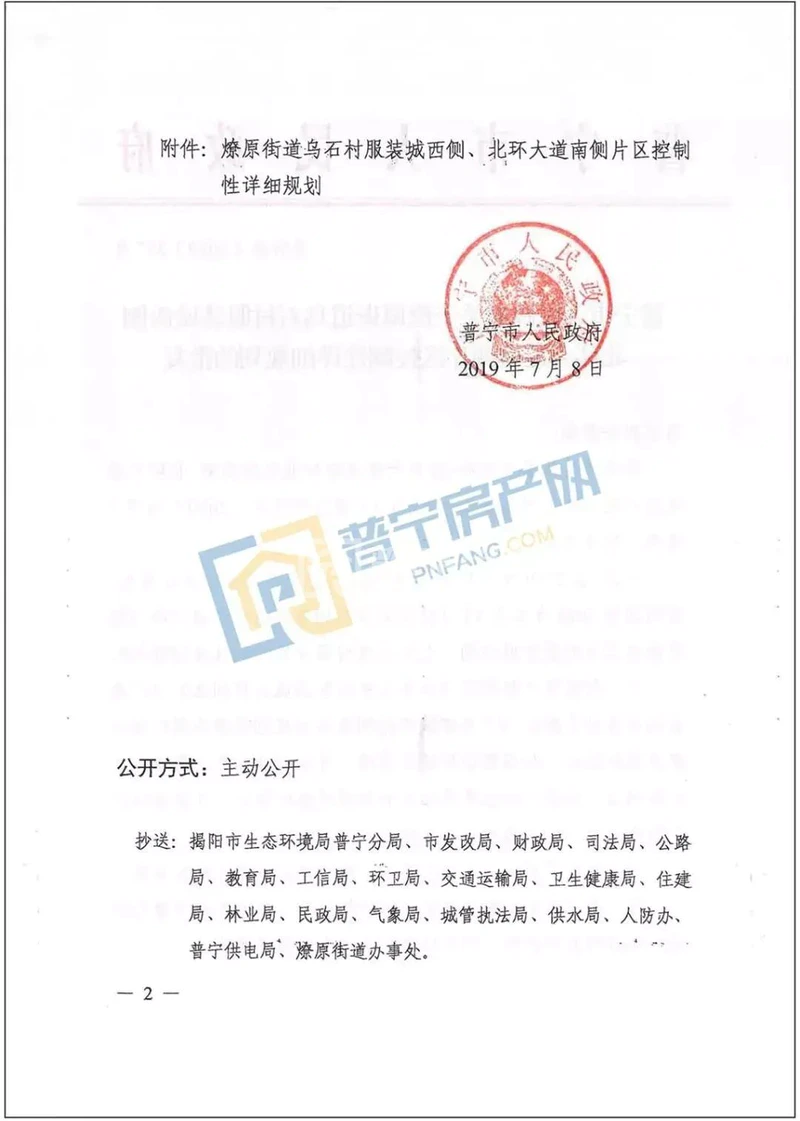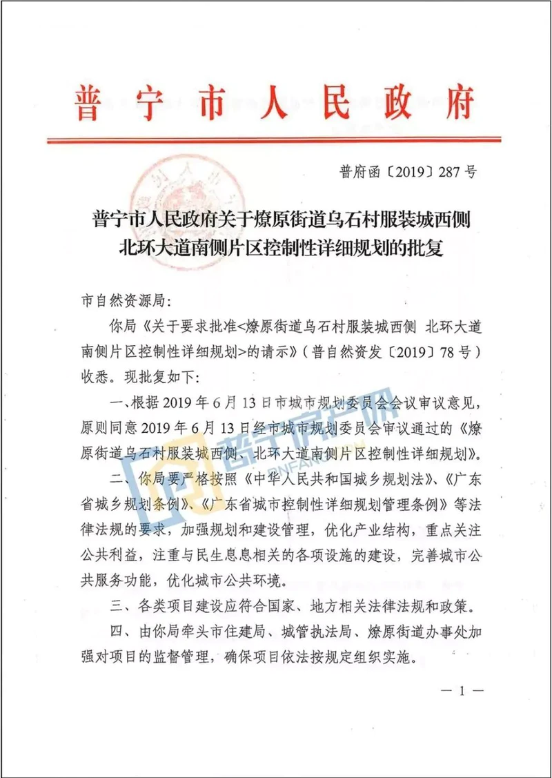 《燎原街道乌石村服装城西侧北环大道南侧片区控制性详细规划》获得普宁市政府批复(普府函[2019]287号),确定该地块功能定位为公共设施齐全,布局完整,环境较好的居住小区。
