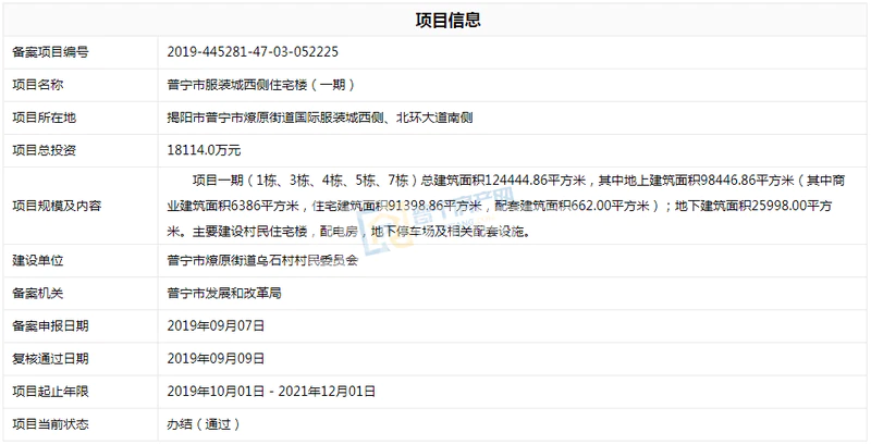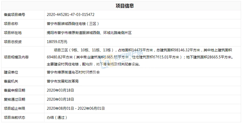 普宁市服装城西侧住宅楼(三区)备案通过,总投资18059万元,项目三区(9栋、10栋、11栋、13栋),占地面积14475平方米,总建筑面积98146.32平方米,其中地上建筑面积69480.82平方米(其中商业建筑面积1865.81平方米,住宅建筑面积67615.01平方米);地下建筑面积28665.5平方米。主要建设村民住宅楼,配电房,地下停车场及相关配套设施。