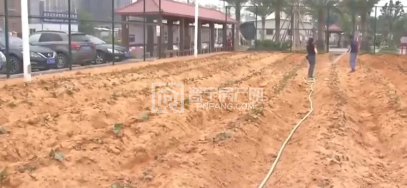 在西陇村文化公园,可以看到有不少村民正在散步休憩,被改成番薯地的篮球场就在公园的一侧,虽然篮球场的围栏和照明灯都还在,但里面已经从平地变成了农地,有两位农民正在给农作物浇水。