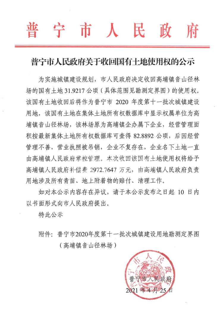 为实施城镇建设规划,市人民政府决定收回高埔镇音山径林场的国有土地31.9217公顷(具体范围见勘测定界图)的使用权。该国有土地收回后将作为普宁市2020年度第十一批次城镇建设用地,该国有土地在集体土地所有权数据库中显示权属单位为高埔镇音山径林场,该林场原为高埔镇企办属下企业,经营管理面积按最新集体土地所有权数据库可查得82.8892公顷,后因经营管理不善,营业执照被吊销,企业不复存在,企业名下土地一直由高埔镇人民政府掌控管理。本次收回该国有土地使用权将给予高埔镇人民政府补偿费2972.7647万元,由高埔镇人民政府负责用地涉及所有青苗、地上附着物的赔付、清理工作。
