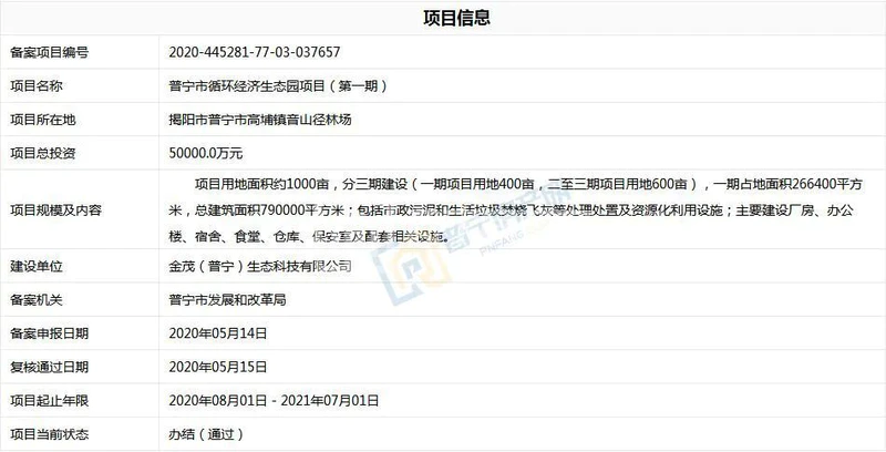 据小房君了解,此次回收的地块将建设普宁市循环经济生态园项目。普宁市循环经济生态园项目(第一期)已于2020年5月备案通过,项目位于普宁市高埔镇音山径林场,总投资50000万元,由金茂(普宁)生态科技有限公司建设,项目用地面积约1000亩,分三期建设(一期项目用地400亩,二至三期项目用地600亩),一期占地面积266400平方米,总建筑面积790000平方米;包括市政污泥和生活垃圾焚烧飞灰等处理处置及资源化利用设施;主要建设厂房、办公楼、宿舍、食堂、仓库、保安室及配套相关设施。