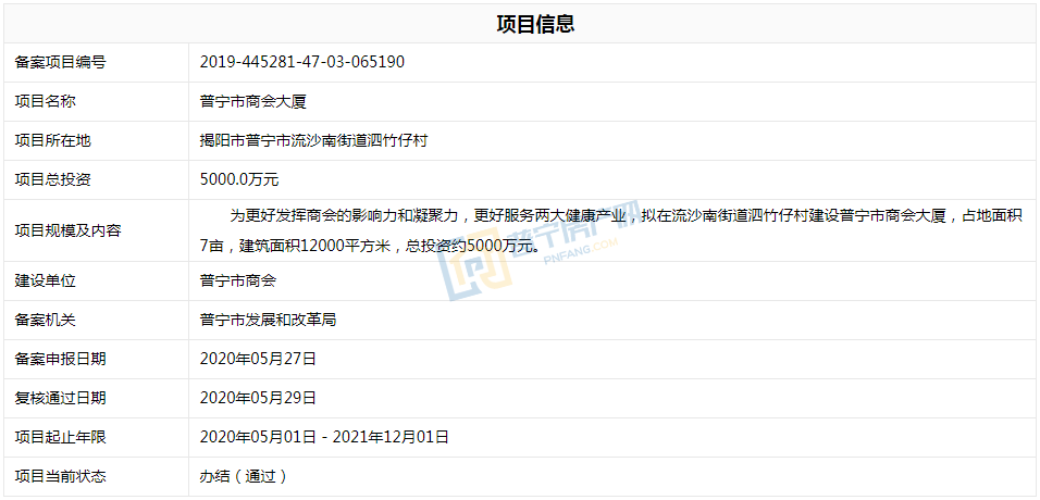2020年5月,普宁市商会大厦备案通过。据了解,为更好发挥商会的影响力和凝聚力,更好服务两大健康产业,拟在流沙南街道泗竹仔(楼盘详情户型图相册地图)村建设普宁市商会大厦,占地面积7亩,建筑面积12000平方米,总投资约5000万元。
