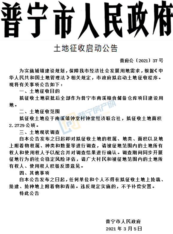 拟征收南溪镇钟堂村钟堂经济联合社,土地面积2.2729公顷(约34.09亩),获批后全部作为普宁市南溪粮食储备仓库项目建设用地。