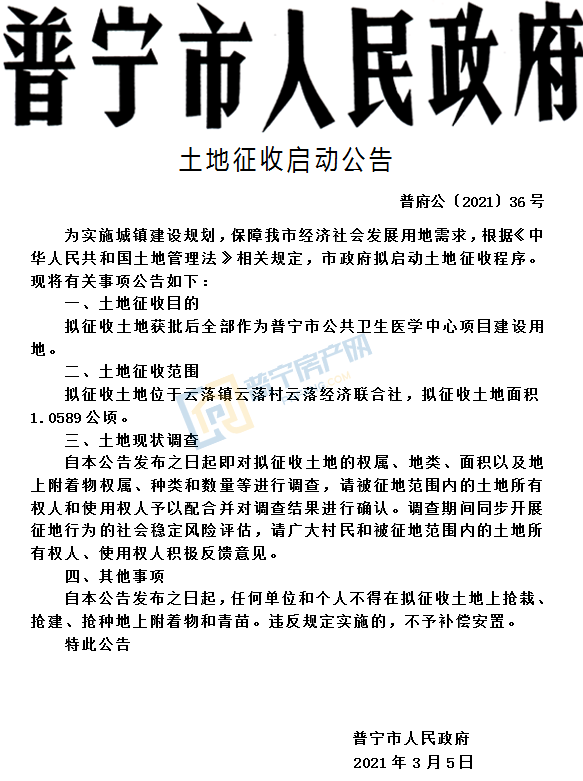拟征收云落镇云落村云落经济联合社,土地面积1.0589公顷(约15.88亩),获批后全部作为普宁市公共卫生医学中心项目建设用地。