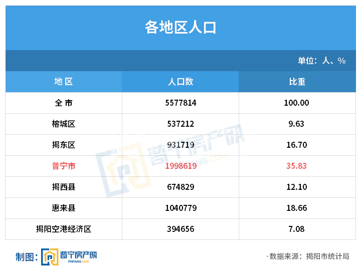 根据第七次全国人口普查结果,普宁市常住人口1998619人,占揭阳全市人口的比重35.83%,位居揭阳全市第一。常住人口包括:居住在本乡镇街道且户口在本乡镇街道或户口待定的人;居住在本乡镇街道且离开户口登记地所在的乡镇街道半年以上的人;户口在本乡镇街道且外出不满半年或在境外工作学习的人。