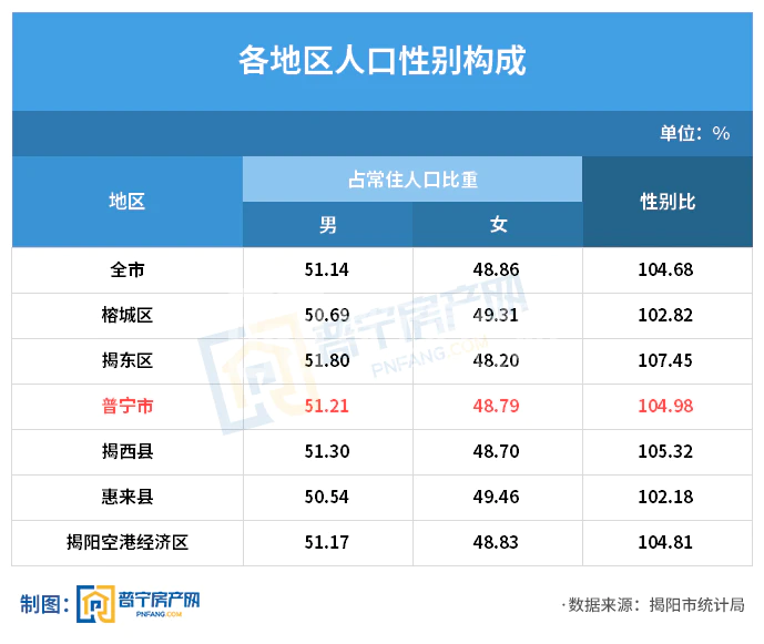 根据第七次全国人口普查结果,普宁市男性人口占比51.21%,女性人口占比48.79%。总人口性别比(已女性为100,男性对女性的比例)为104.98%。