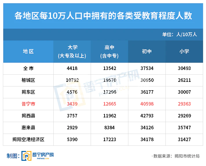 根据第七次全国人口普查结果,普宁市每10万人中拥有大学(大专及以上)文化程度的为3439人,拥有高中(含中专)文化程度的人口为12665人,拥有初中文化程度的人口为40598人,拥有小学文化程度的人口为29363人。