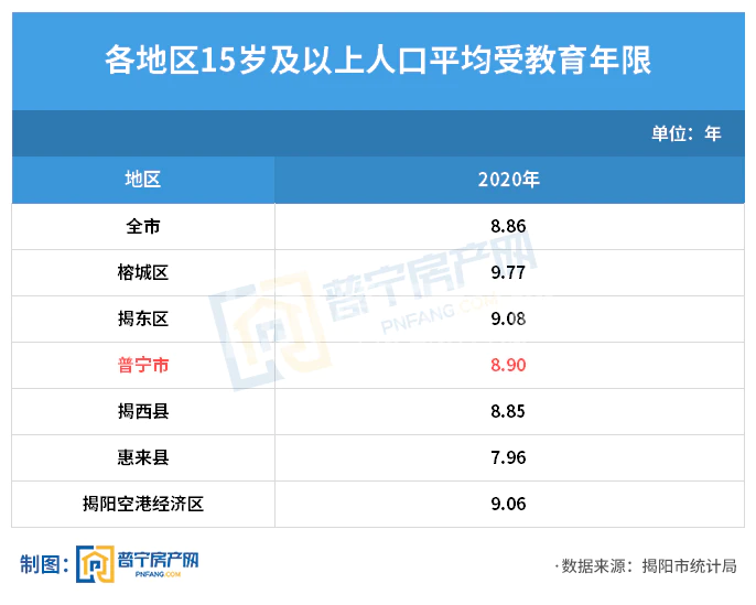 根据第七次全国人口普查结果,普宁市15岁及以上人口的平均受教育年限为8.9年。平均受教育年限是将各种受教育程度折算成受教育年限计算平均数得出的,具体的折算标准是:小学=6年,初中=9年,高中=12年,大专及以上=16年。