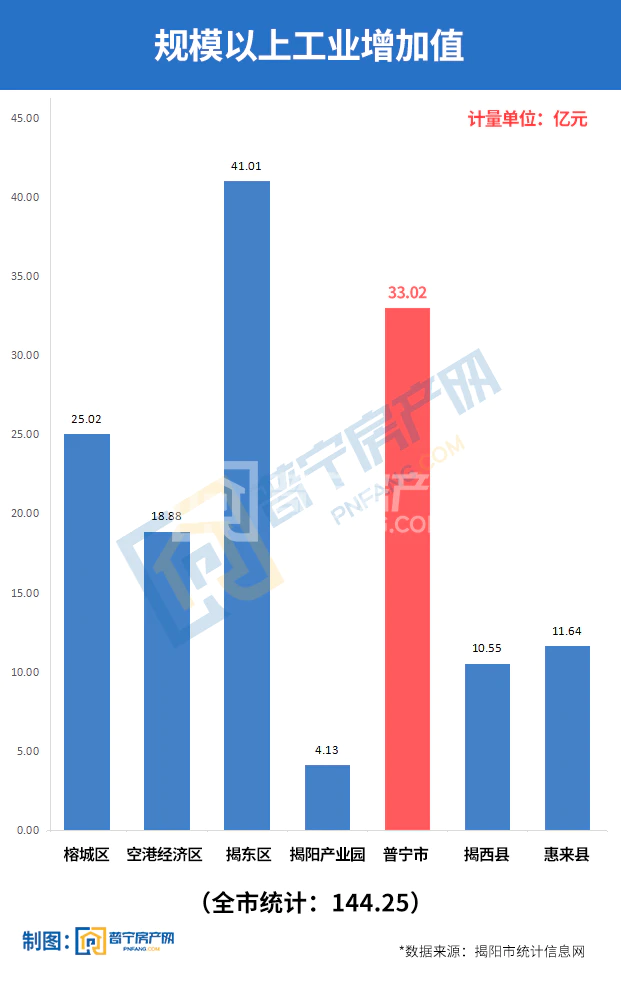工业生产平稳运行。1-4月,揭阳全市规上工业增加值144.25亿元,增长15.1%,两年平均增长3.5%。其中,揭东区以41.01亿元位居第一,普宁市以33.02亿元位居第二,榕城区以25.02亿元位居第三。