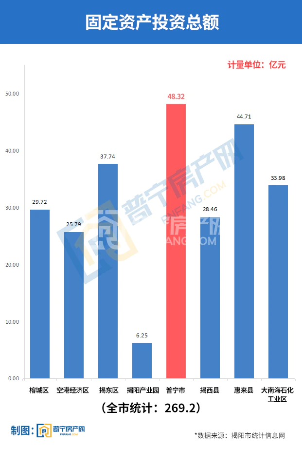 投资继续下降。1-4月,揭阳全市固定资产投资269.20亿元,下降14.6%,两年平均下降10.8%。其中,普宁市以48.32亿元位居第一,惠来县以44.71亿元位居第二,揭东区以37.74亿元位居第三。