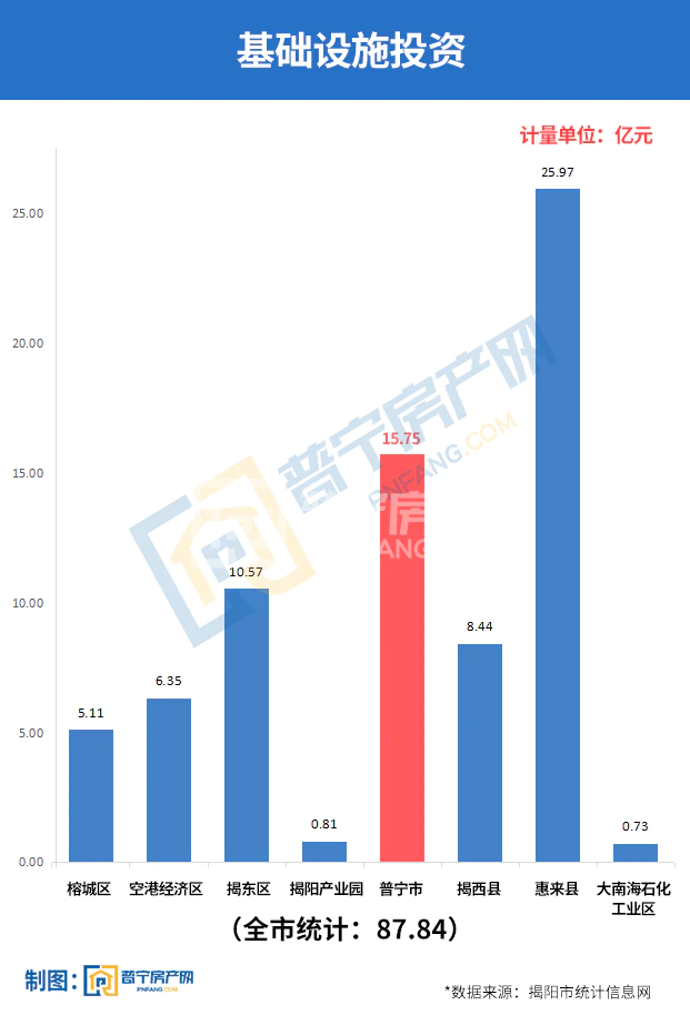 基础设施投资降幅扩大。1-4月,揭阳全市基础设施投资完成87.84亿元,下降32.7%,降幅比一季度扩大12.5个百分点。其中,惠来县以25.97亿元位居第一,普宁市以15.75亿元位居第二,揭东区以10.57亿元位居第三。