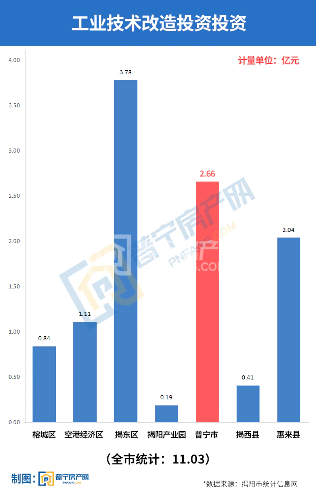 1-4月,揭阳全市工业技术改造投资11.03亿元,同比下降45.3%。其中,揭东区以3.78亿元位居第一,普宁市以2.66亿元位居第二,惠来县以2.04亿元位居第三。