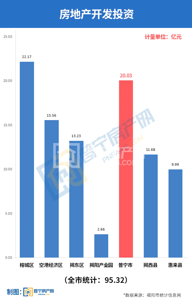 1-4月,揭阳全市房地产开发投资95.32亿元,下降10.8%。其中,榕城区以22.17亿元位居第一,普宁市以20.03亿元位居第二,空港经济区以15.56亿元位居第三。