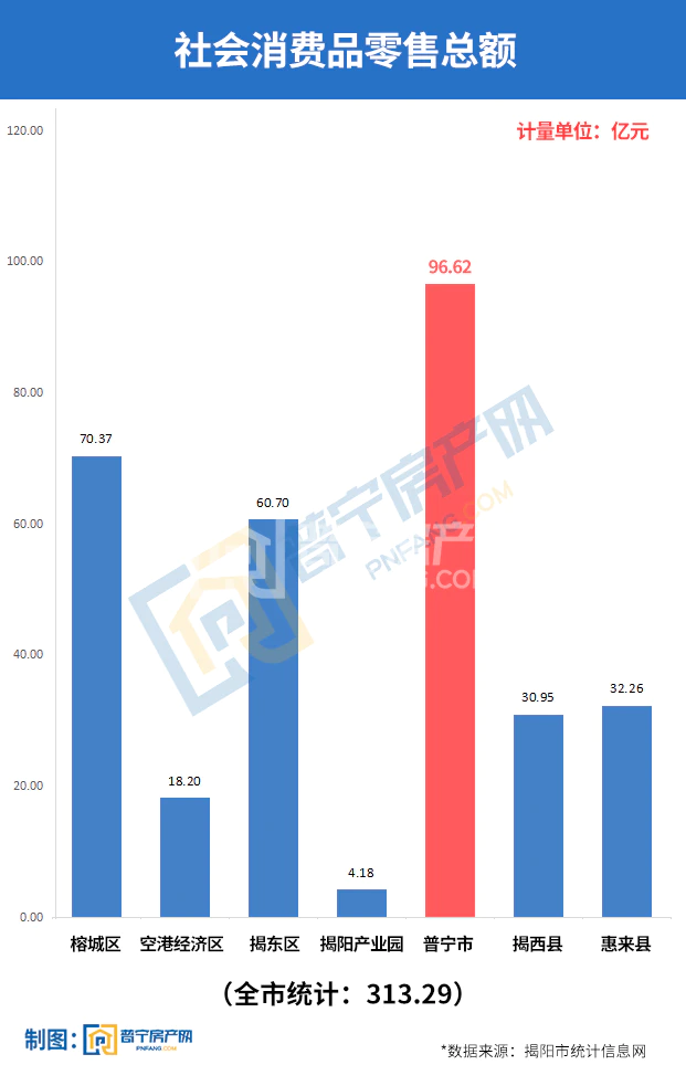 消费市场有序恢复。1-4月,揭阳全市实现社会消费品零售总额313.29亿元,增长23.9%,两年平均增长0.1 %。其中,普宁市以96.62亿元位居第一,榕城区以70.37亿元位居第二,揭东区以60.7亿元位居第三。