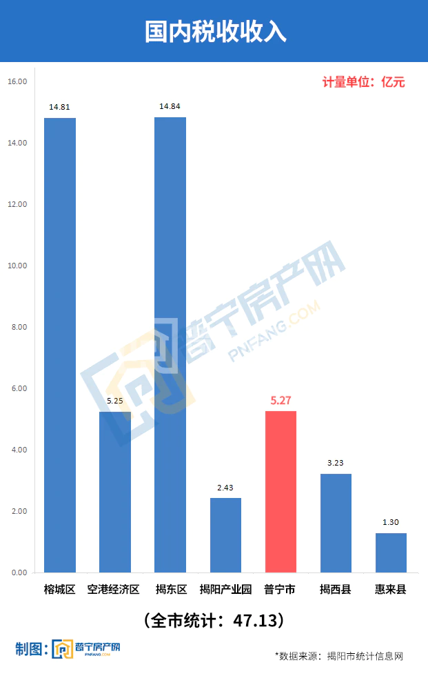 1-4月,揭阳全市国内税收收入47.13亿元,增长28.7%。其中,揭东区以14.84亿元位居第一,榕城区以14.81亿元位居第二,普宁市以5.27亿元位居第三。