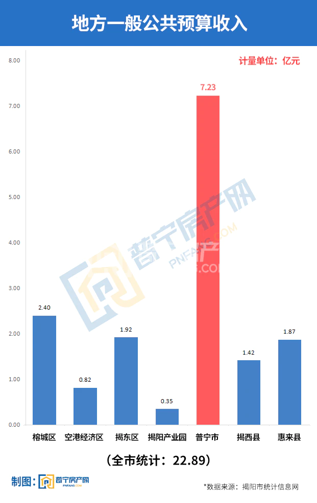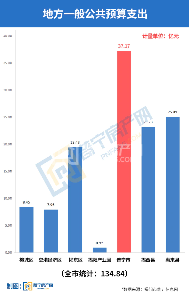 1-4月,揭阳全市一般公共预算支出134.84亿元,增长0.04%。其中,普宁市以37.17亿元位居第一,惠来县以25.09亿元位居第二,揭西县以23.23元位居第三。