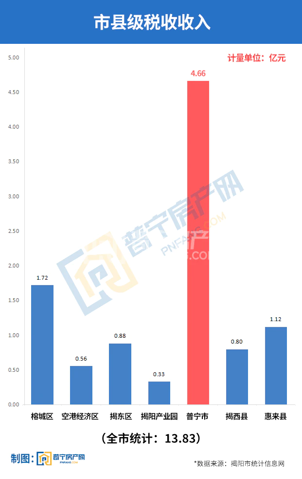 1-4月,揭阳全市市县级税收收入13.83亿元,同比增长20%。其中,普宁市以4.66亿元位居第一,榕城区以1.72亿元位居第二,惠来县以1.12亿元位居第三。
