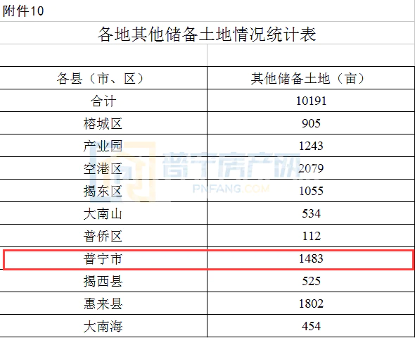 7.其他储备土地10191亩(详见附件10)。各地要加大招商引资力度,尽快安排土地供应,促进项目落地,推动经济发展;对于地块零碎难以单宗供应土地的,按照《揭阳市严格落实控规单元规范土地征收整合储备工作实施办法》进行整合储备后实施供地。