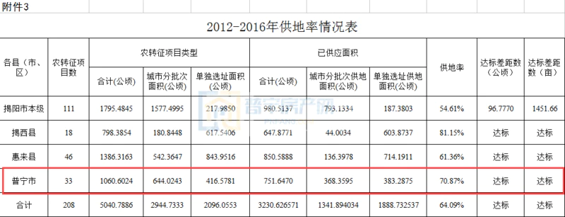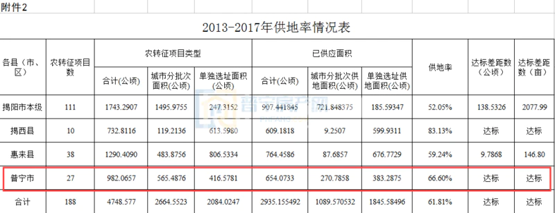 全市2013年至2017年供地率61.81%。市本级(含揭东区、榕城区、空港经济区、揭阳产业园)供地率为52.05%,距达标还差2078亩;惠来县供地率为59.24%,距达标还差147亩。如至年底前供地率还低于60%,2019年市本级和惠来县计划指标将被暂停使用(除国家重点项目和民生保障项目外)(详见附件2)。其它县都已达标。