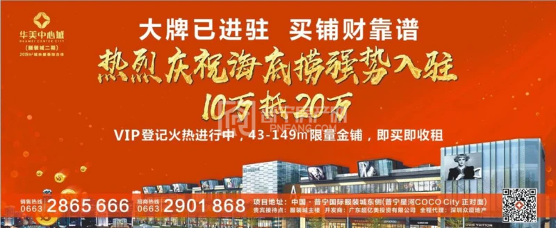 华美中心城,上百万的人潮涌动,构筑繁华商业旺地。项目将引进知名品牌,通过智能化的管理和强大的人才汇聚力,致力将项目打造成普宁最年轻、最时尚、最现代的商业综合体,助推普宁的商业发展,提升片区品质,为普宁市民带来全新的时尚生活方式!