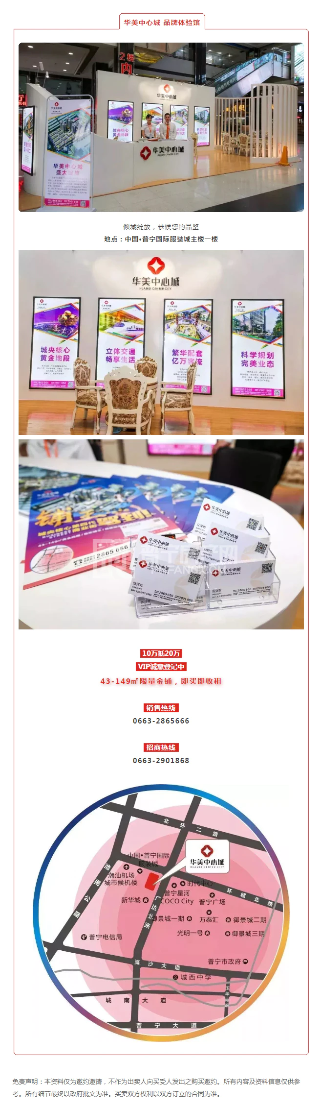 华美中心城由广东超亿美投资有限公司高标准规划、大手笔投资的大型综合性项目,坐落于环市北路与广达北路黄金交叉点,毗邻中国·普宁国际服装城一期,正对时代中心(普宁星河COCO City,沃尔玛)、周边聚集普宁广场、万泰汇、新华城(楼盘详情户型图相册地图0663-2559559)、御景城等人流汇集项目,商圈效应辐射整个大粤东,是普宁城市发展的新轴心。