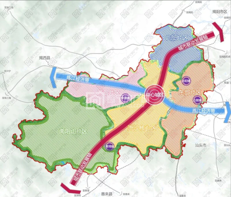 构建“一心两轴五片区”市域空间结构。其中,“一心”为中心城区,在巩固提升综合服务功能的基础上,强化风貌治理和环境营造,建设高品质宜居城区。依托练江经济带,向西对接珠三角产业转移,向东带动练江经济带转型升级。依托城市联动轴串联生物医药、休闲旅游、生态居住、观光农业等要素。“五片区”包括流沙核心区、南阳山片区、西部片区、北部片区、东部片区,各片区根据资源特色和发展条件探索差异化发展路径。