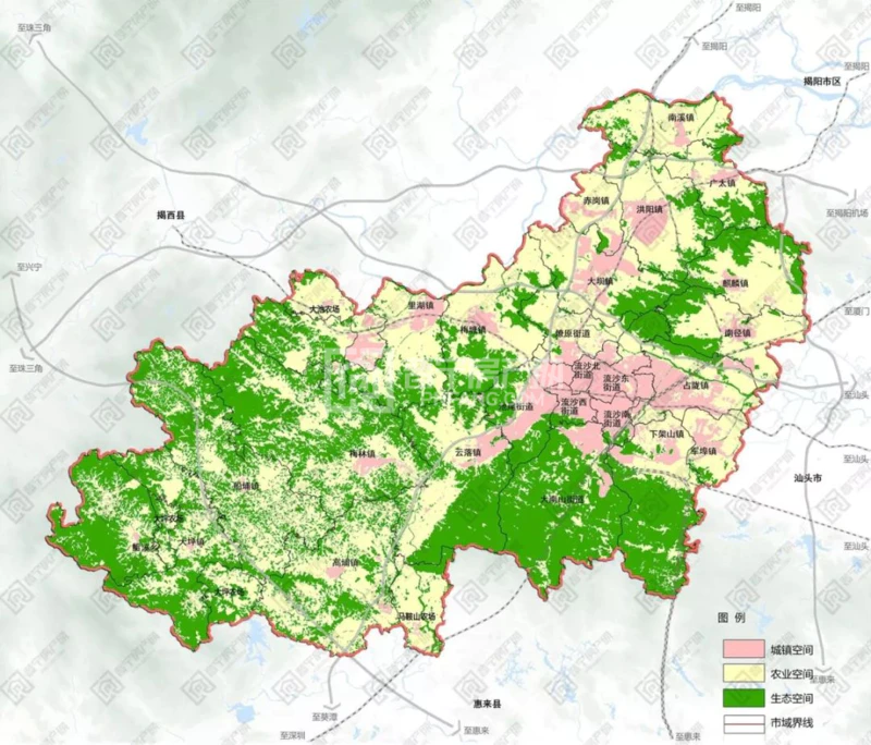 构建“中心城区-中心镇-特色镇-一般镇”四级城镇等级体系。其中,中心镇包括洪阳镇、占陇镇、里湖镇、高埔镇,特色镇包括军埠镇、云落镇、南径镇、大坪镇、南溪镇,一般镇包括下架山镇、赤岗镇、大坝镇、麒麟镇、广太镇、梅塘镇、船埔镇、梅林镇、后溪乡、大坪农场、马鞍山农场、大池农场。