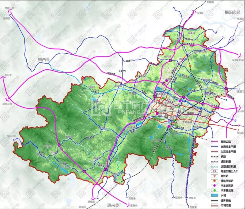 落实揭阳市城市总体规划确定的高速公路网络,打造“三横两纵”的高速网络。其中,三横包括潮惠高速、汕梅高速、汕湛高速,两纵包括揭普高速、揭惠高速。