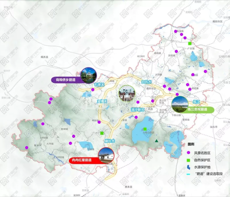 落实省委省政府工作部署,打造“百里碧道”。其中核心碧道环作为普宁百里碧道的核心,串联燎原街道、中心城区、里湖镇、梅林镇、云落镇等镇区,形成环状开敞空间体系。商埠侨乡碧道突出里湖镇、普侨区特色,沿河两侧设置公共商业空间和华侨特色元素小品。练江景观碧道在水环境治理的基础上,增强滨水景观性。冉冉红星碧道依托大南山(楼盘详情户型图相册地图)革命风景区,沿崩坎水打造红色主题景观碧道。