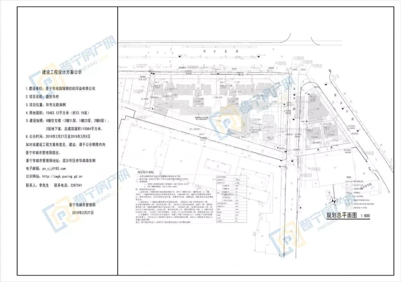 近日,普宁市城市管理局公示了《盛世华府(楼盘详情户型图相册地图0663-2559559)设计方案》,该项目位于环市北路南侧,其用地面积为15463.12平方米(折23.19亩)。