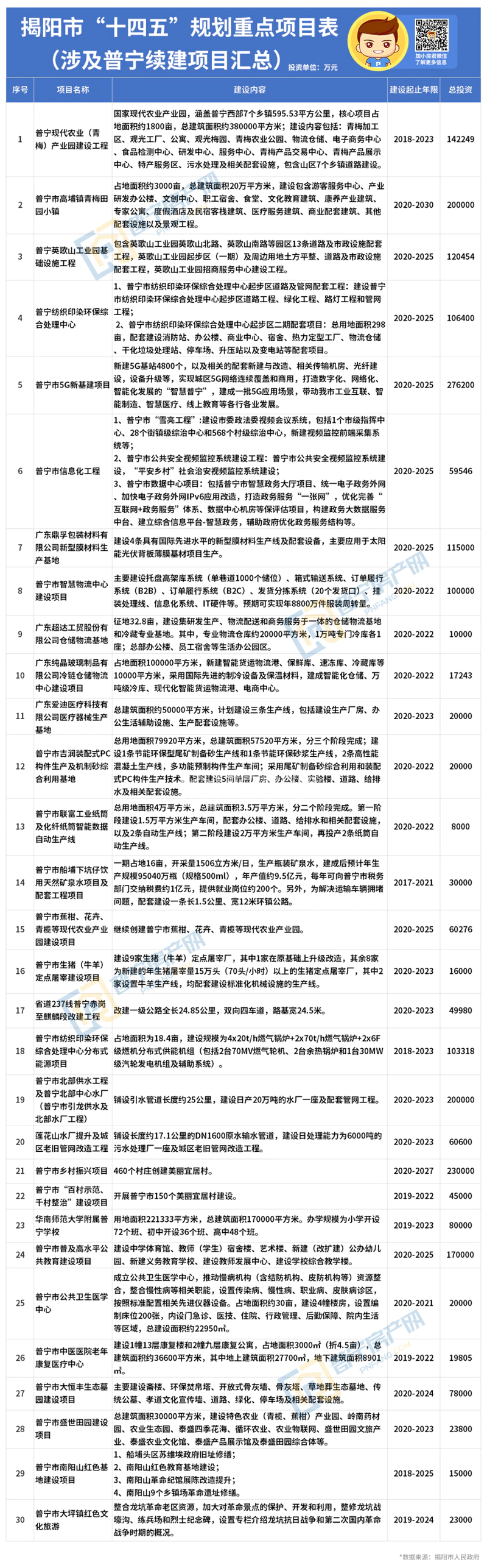 近日,《揭阳市国民经济和社会发展第十四个五年规划和2035年远景目标纲要》业经市六届人大七次会议审议批准。就在今天,揭阳市人民政府发布了《揭阳市“十四五”规划重点项目表》,据小房君统计,揭阳市“十四五”规划重点项目中涉及普宁项目共83个,总投资达20428686万元,其中新开工项目53个共18008815万元,续建项目30个共2419871万元。一起来看看吧!