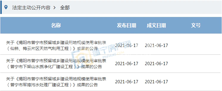 近日,普宁市自然资源局发布了三则关于普宁市预留城乡建设用地规模使用审批表成果的公告,涉及普宁市军埠污水处理厂建设工程、普宁市下架山水质净化厂建设工程、仙桥、梅云片区天然气利用工程三个民生项目。地块总面积2.5771公顷(38.6565亩),落实后全部调整为规划城乡建设用地。