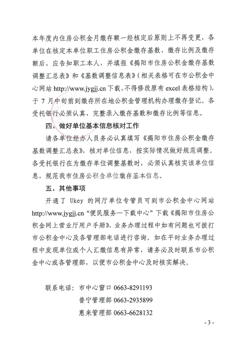 本年度内住房公积金月缴存额一经核定后原则上不再变更,各单位在核定本单位职工住房公积金缴存基数、缴存比例及缴存额后,应告知职工本人,并填报《揭阳市住房公积金缴存基数调整汇总表》和《基数调整信息表》(相关表格可在公积金中心网站 http://www.jygjj.cn下载,不得修改原有excel表格结构),于7月中旬前到缴存所在地公积金管理机构办理缴存登记。各受托银行必须认真、完整录入缴存基数和缴存比例等信息。