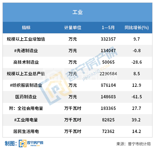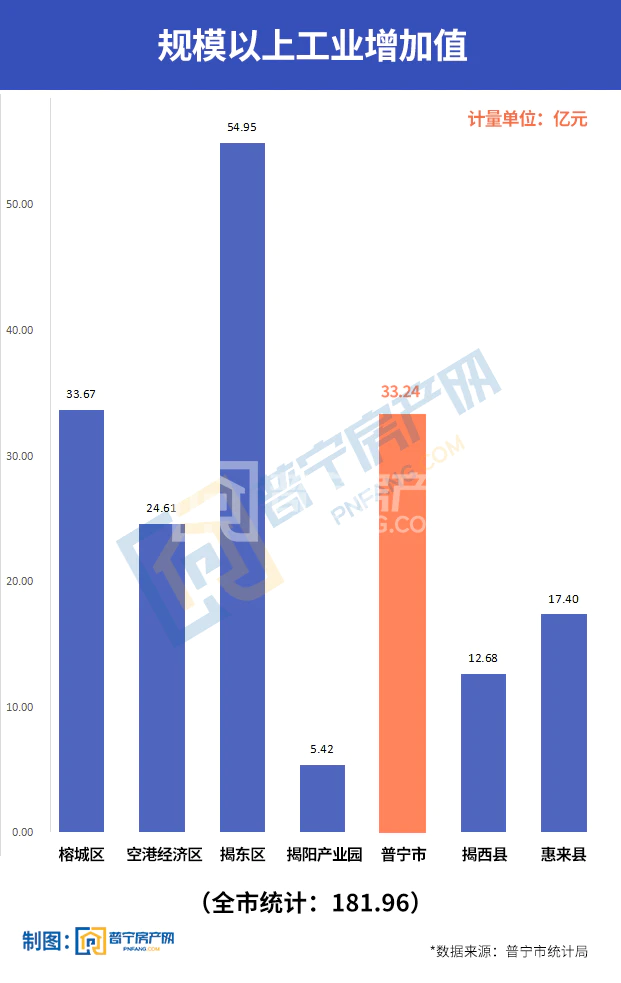 1-5月,揭阳全市规上工业增加值181.96亿元,增长18.0%,增速比1-4月提高2.9个百分点,两年平均增长5.8%。其中,揭东区以54.95亿元位居第一,榕城区以33.67亿元位居第二,普宁市以33.24亿元位居第三。