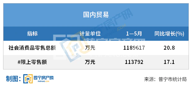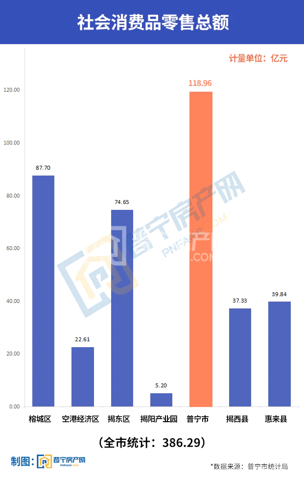 1-5月,揭阳全市实现社会消费品零售总额386.29亿元,增长21.2%,增速比1-4月回落2.7个百分点,两年平均下降1.0%。其中,普宁市以118.96亿元位居第一,榕城区以87.7亿元位列第二,揭东区以74.65亿元位列第三。