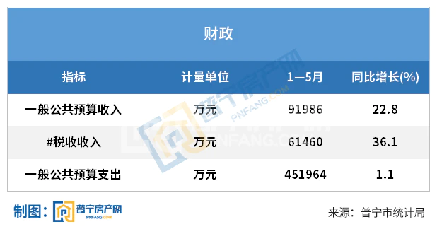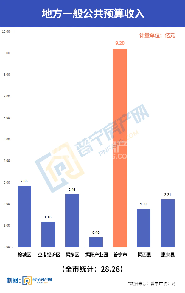 1-5月,揭阳全市实现地方一般公共预算收入28.28亿元,增长14.7%,增速比1-4月回落1.9个百分点,两年平均增长1.3%。其中,普宁市以9.2亿元位居第一,榕城区以2.86亿元位列第二,揭东区2.46亿元位居第三。