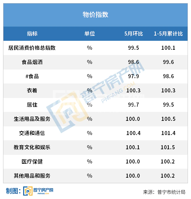 1-5月,全市居民消费价格指数(CPI)累计上涨0.1%,涨幅比全省(-0.1%)提高0.2个百分点。其中,食品类下降1.4%,降幅比1-4月收窄0.3个百分点。