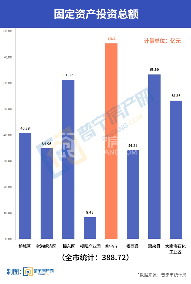 1-5月,揭阳全市1-5月固定资产投资388.72亿元,下降11.2%,降幅比1-4月收窄3.4个百分点,两年平均下降6.8%。其中,普宁以75.2亿元位居第一,惠来县以63.39亿元位居第二,揭东区以61.37亿元位居第三。
