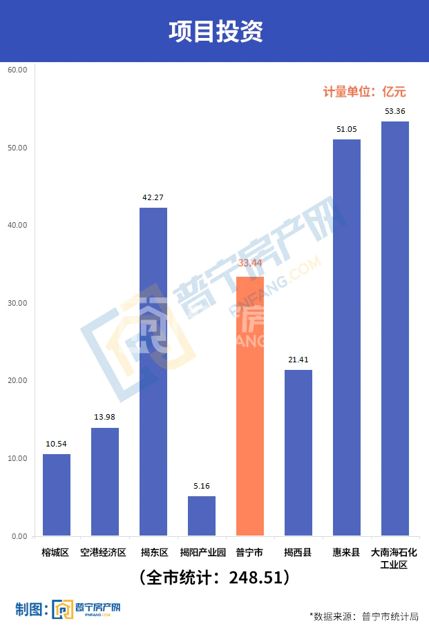 1-5月,揭阳全市项目投资248.51亿元,下降19.0%,降幅比1-4月扩大2.4个百分点。其中,大南海石化工业区以53.36亿元位居第一,惠来县以51.05亿元位居第二,揭东区以42.27亿元位居第三,普宁以33.44亿元位居第四。