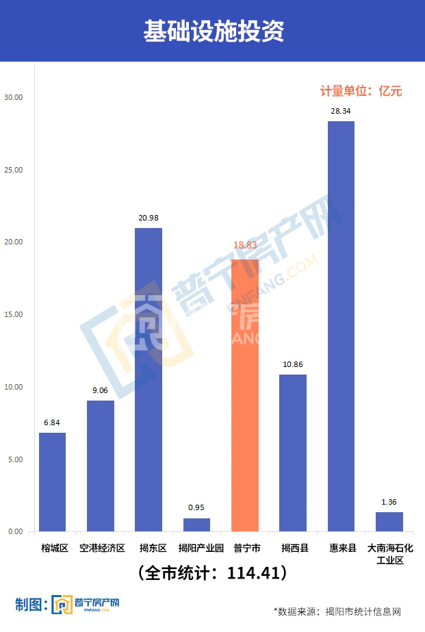 1-5月,揭阳全市基础设施投资114.41亿元,下降35.5%。其中,惠来县以28.34亿元位居第一,揭东区20.98亿元位居第二,普宁以18.83亿元位居第三。