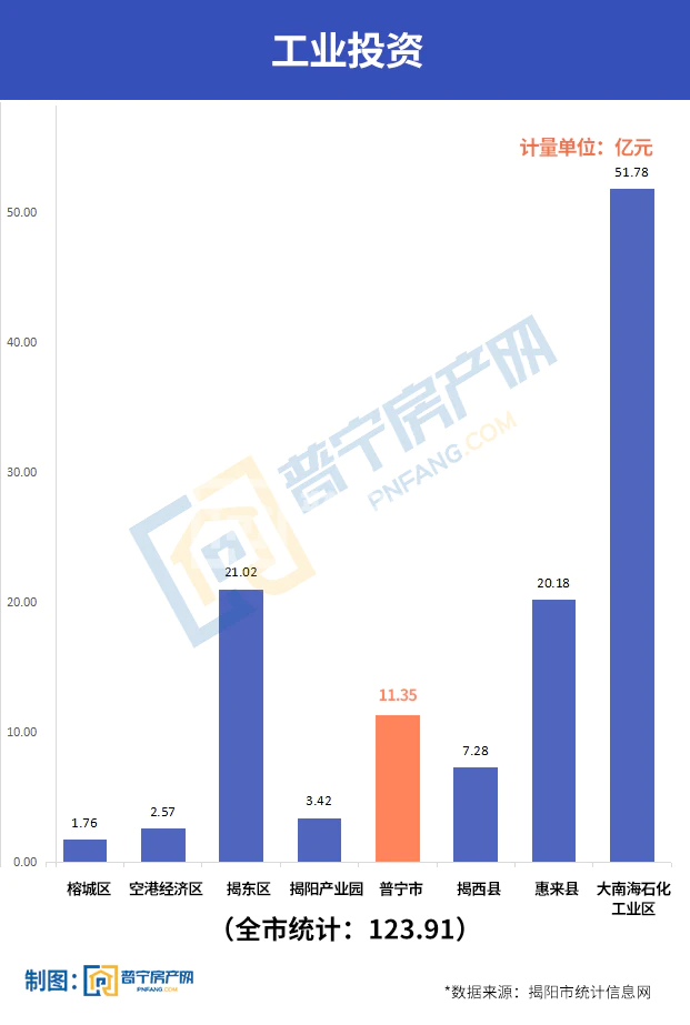 1-5月,揭阳全市工业投资123.91亿元,增长12.7%。其中,大南海石化工业区以51.78亿元位居第一,揭东区以21.02亿元位居第二,惠来县以20.18亿元位列第三,普宁市以11.35亿元位居第四。